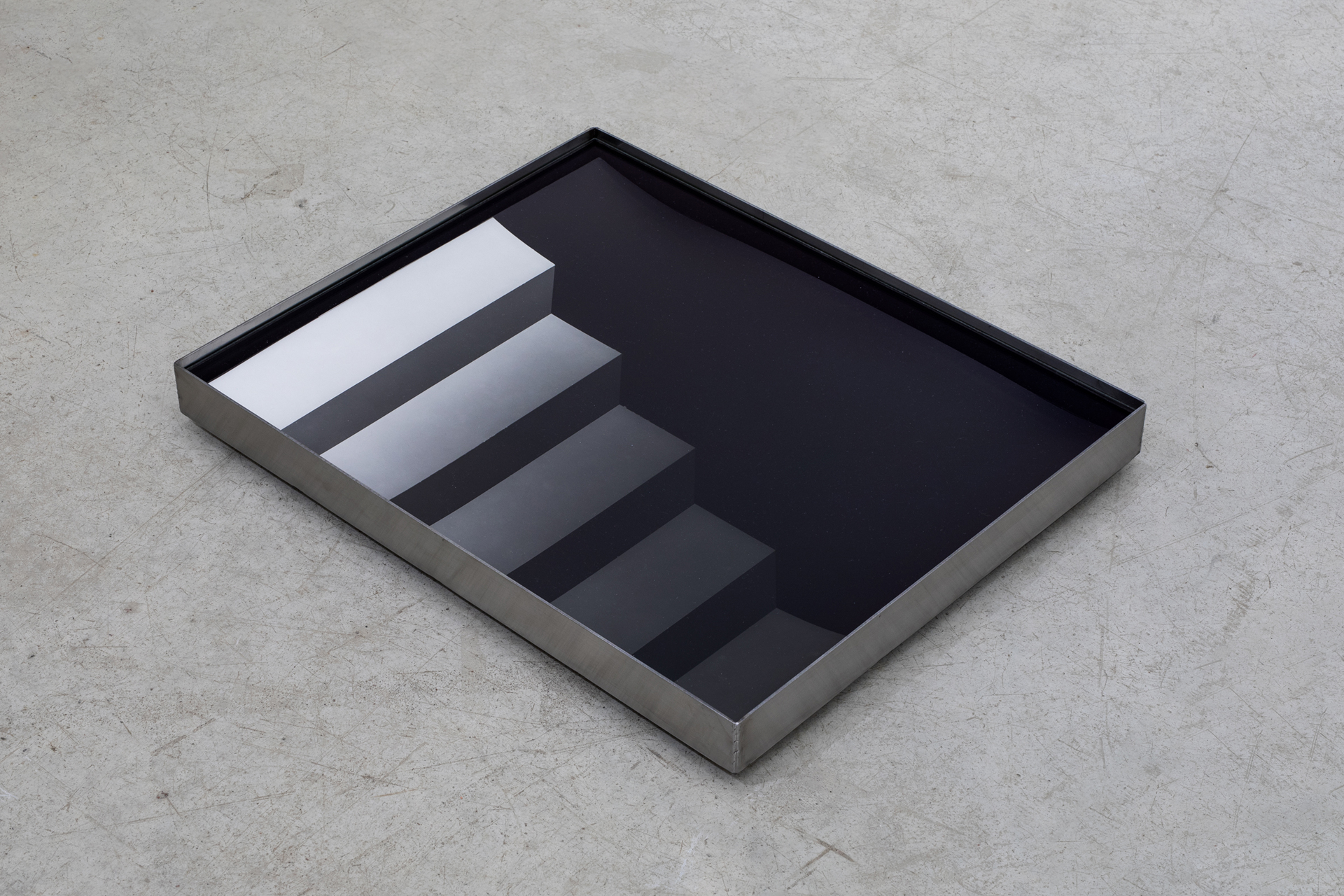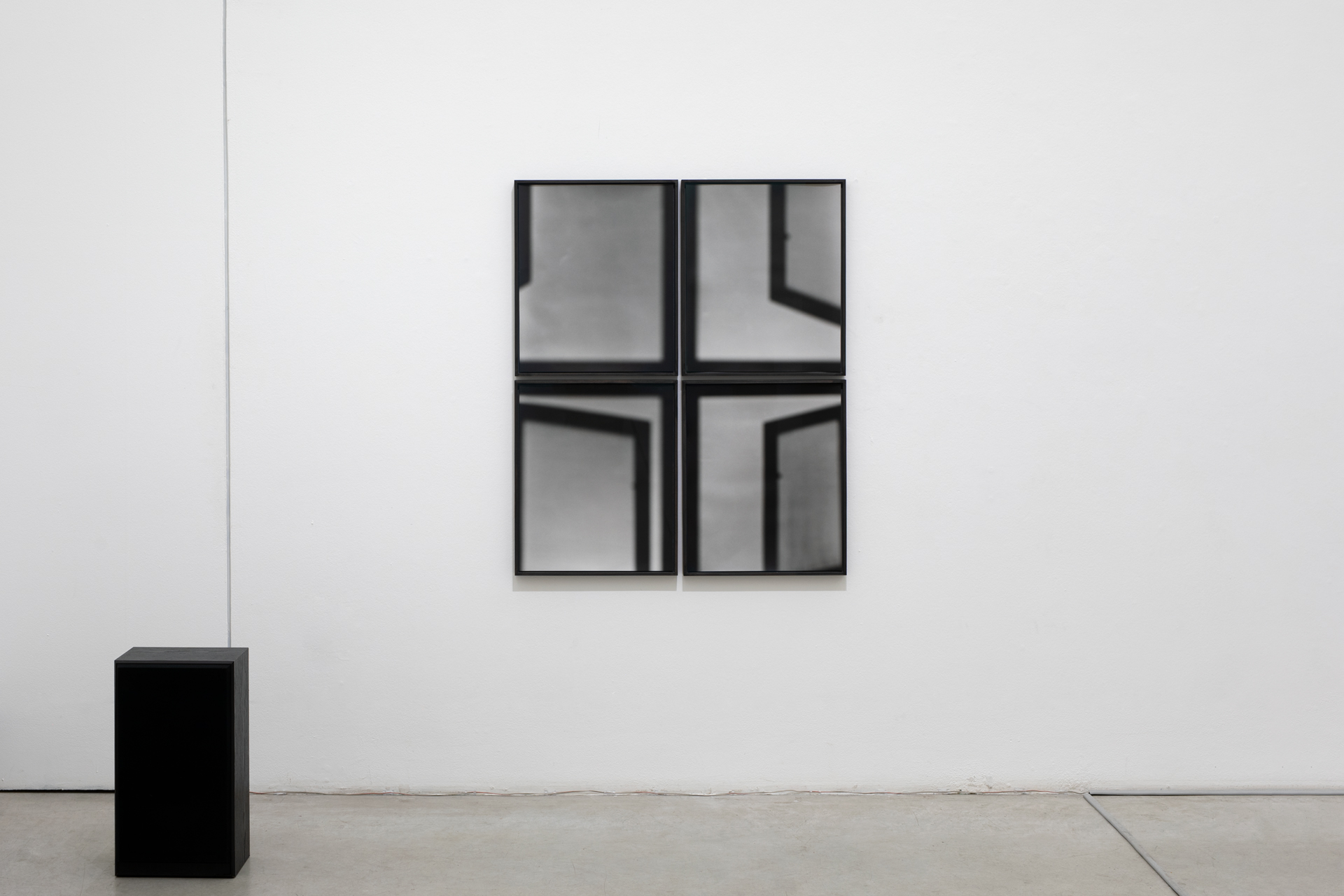 aluminium frames, each holding four photographs that depict the movement of shadows cast by doors opening into a dark room and a light room. This contrast between